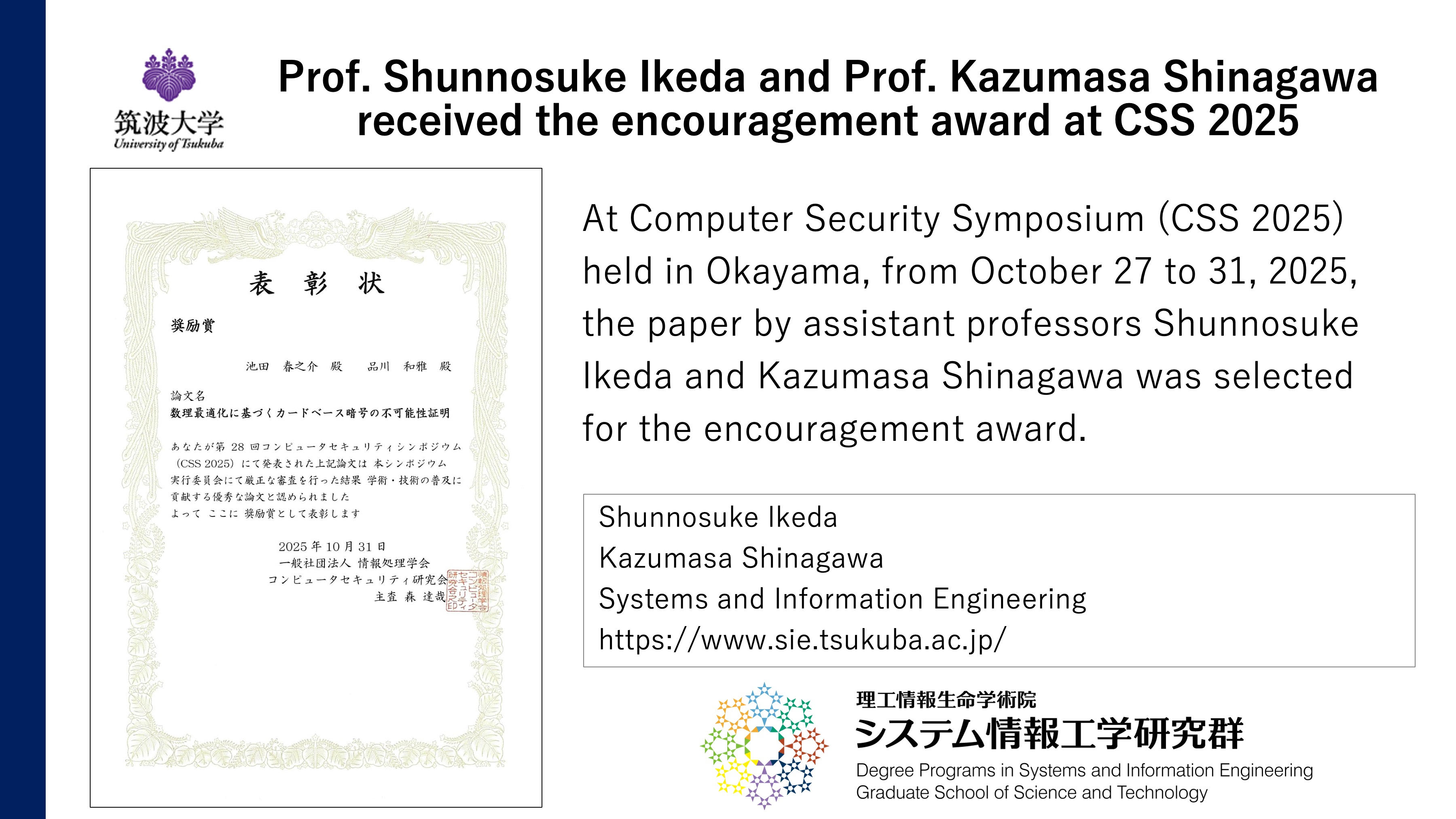 At Computer Security Symposium (CSS 2025) held in Okayama, from October 27 to 31, 2025, the paper by assistant professors Shunnosuke Ikeda and Kazumasa Shinagawa was selected for the encouragement award.