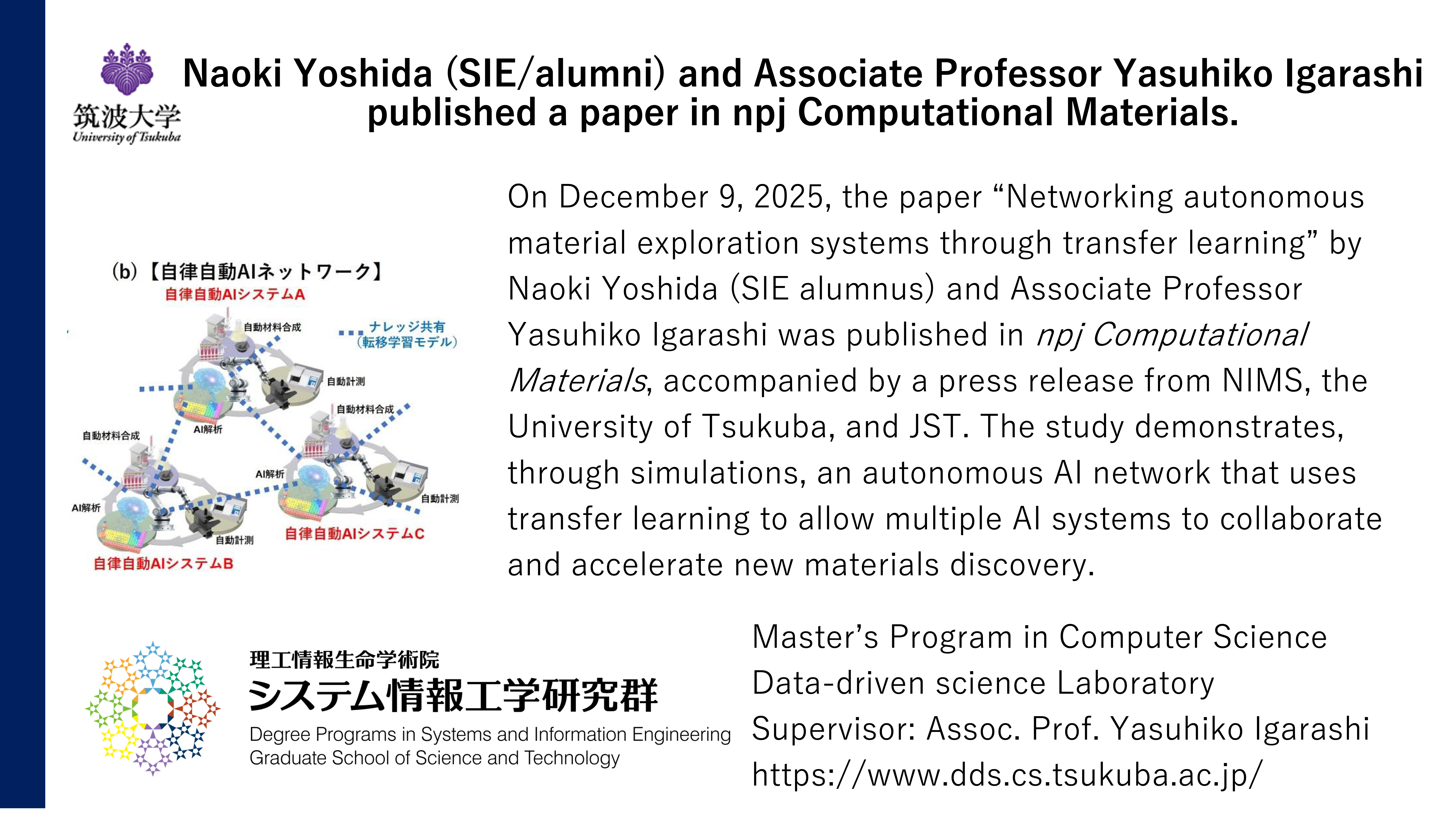 On December 9, 2025, the paper “Networking autonomous material exploration systems through transfer learning” by Naoki Yoshida (SIE alumnus) and Associate Professor Yasuhiko Igarashi was published in npj Computational Materials, accompanied by a press release from NIMS, the University of Tsukuba, and JST. The study demonstrates, through simulations, an autonomous AI network that uses transfer learning to allow multiple AI systems to collaborate and accelerate new materials discovery.