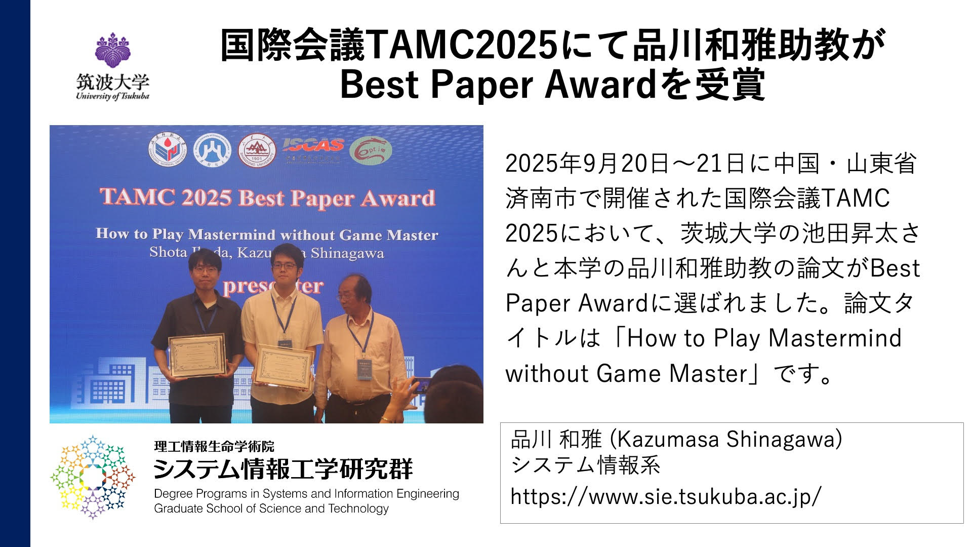 2025年9月20日〜21日に中国・山東省済南市で開催された国際会議TAMC 2025において、茨城大学の池田昇太さんと本学の品川和雅助教の論文がBest Paper Awardに選ばれました。論文タイトルは「How to Play Mastermind without Game Master」です。