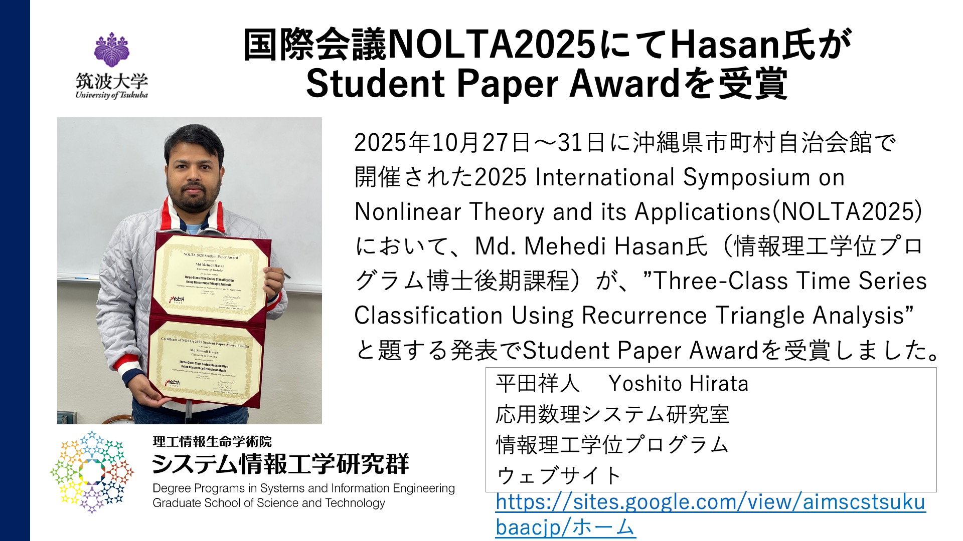 2025年10月27~31日に沖縄県市町村自治会館で開催された2025 International Symposium on Nonlinear Theory and its Applications (NOLTA2025)において,Md. Mehedi Hasan氏(情報理工学位プログラム博士後期課程)が,”Three-Class Time Series Crassification Using Recurrence Triangle Analysis”と題する発表でStudent Paper Awardを受賞しました.